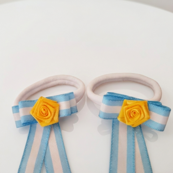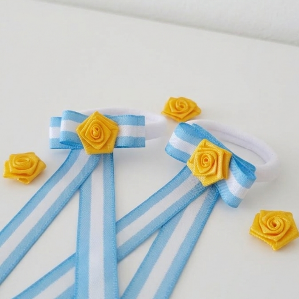 moño en tonos celeste y blanco, clip firme que sujeta bien el cabello, diseño liviano y cómodo para niñas